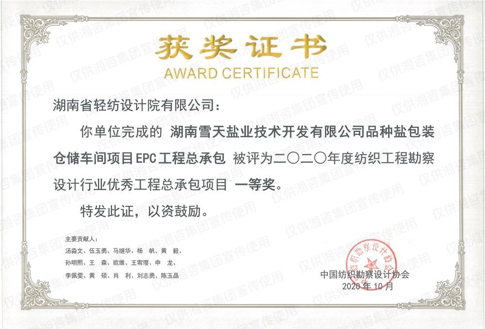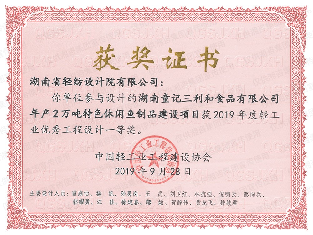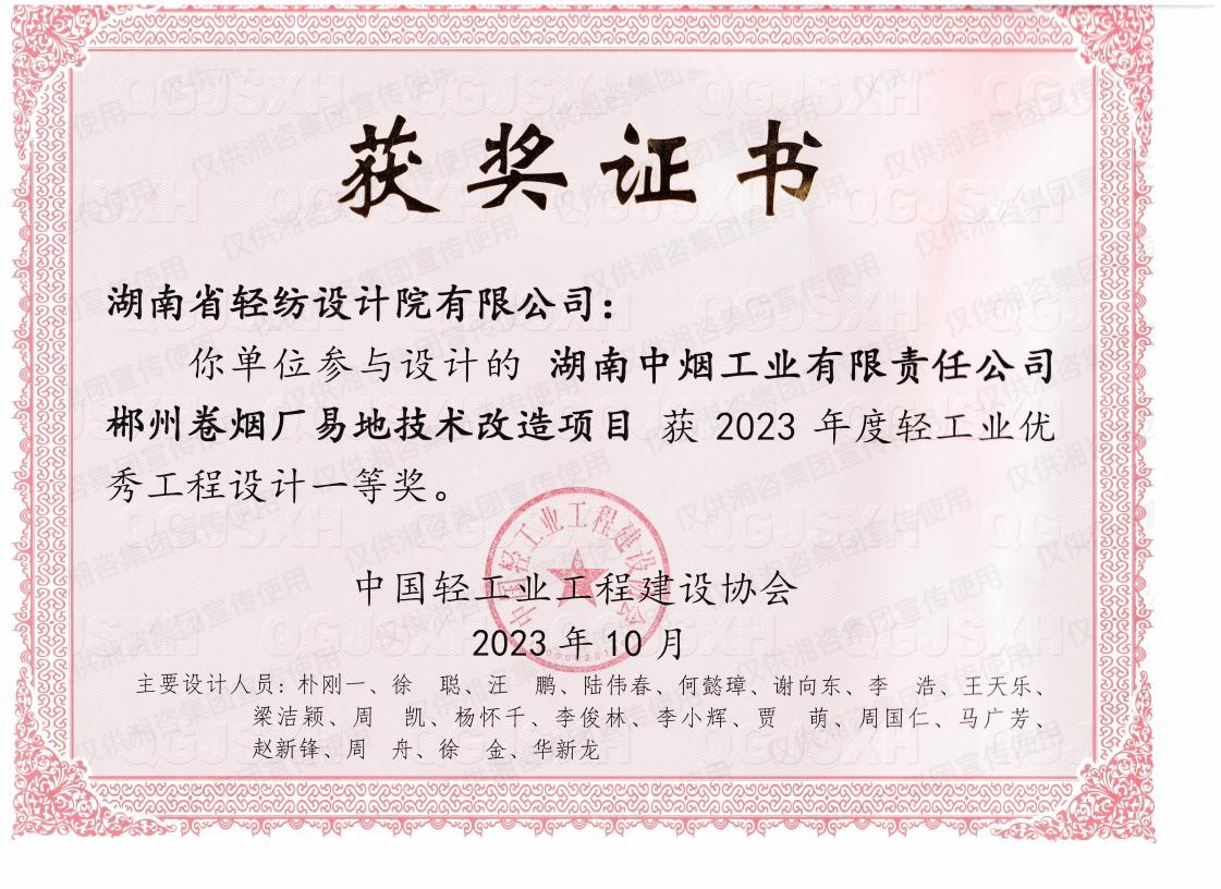 中國(guó)輕工業(yè)工程建設(shè)協(xié)會(huì)優(yōu)秀工程設(shè)計(jì)一等獎(jiǎng)