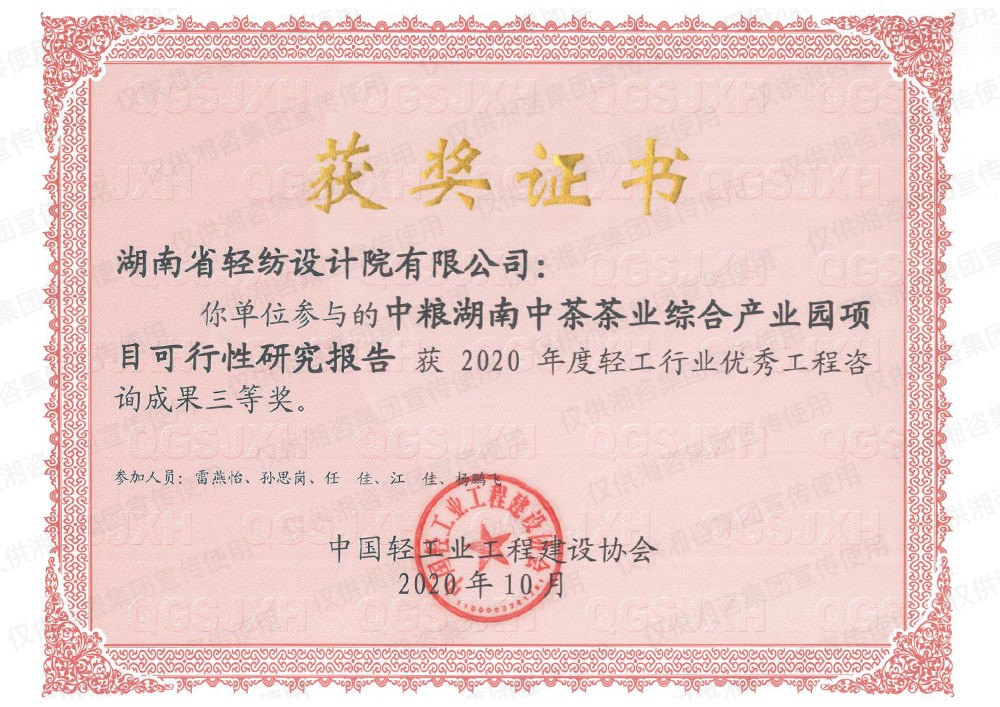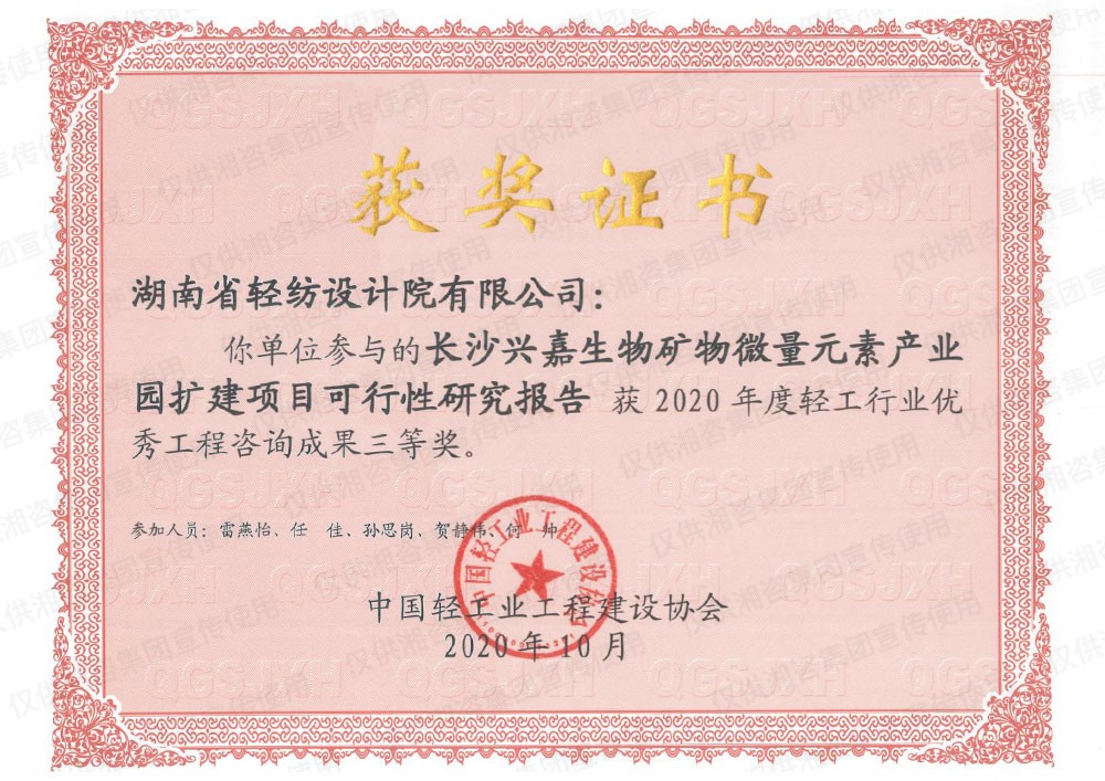 中國(guó)輕工業(yè)工程建設(shè)協(xié)會(huì)優(yōu)秀工程咨詢(xún)成果三等獎(jiǎng)