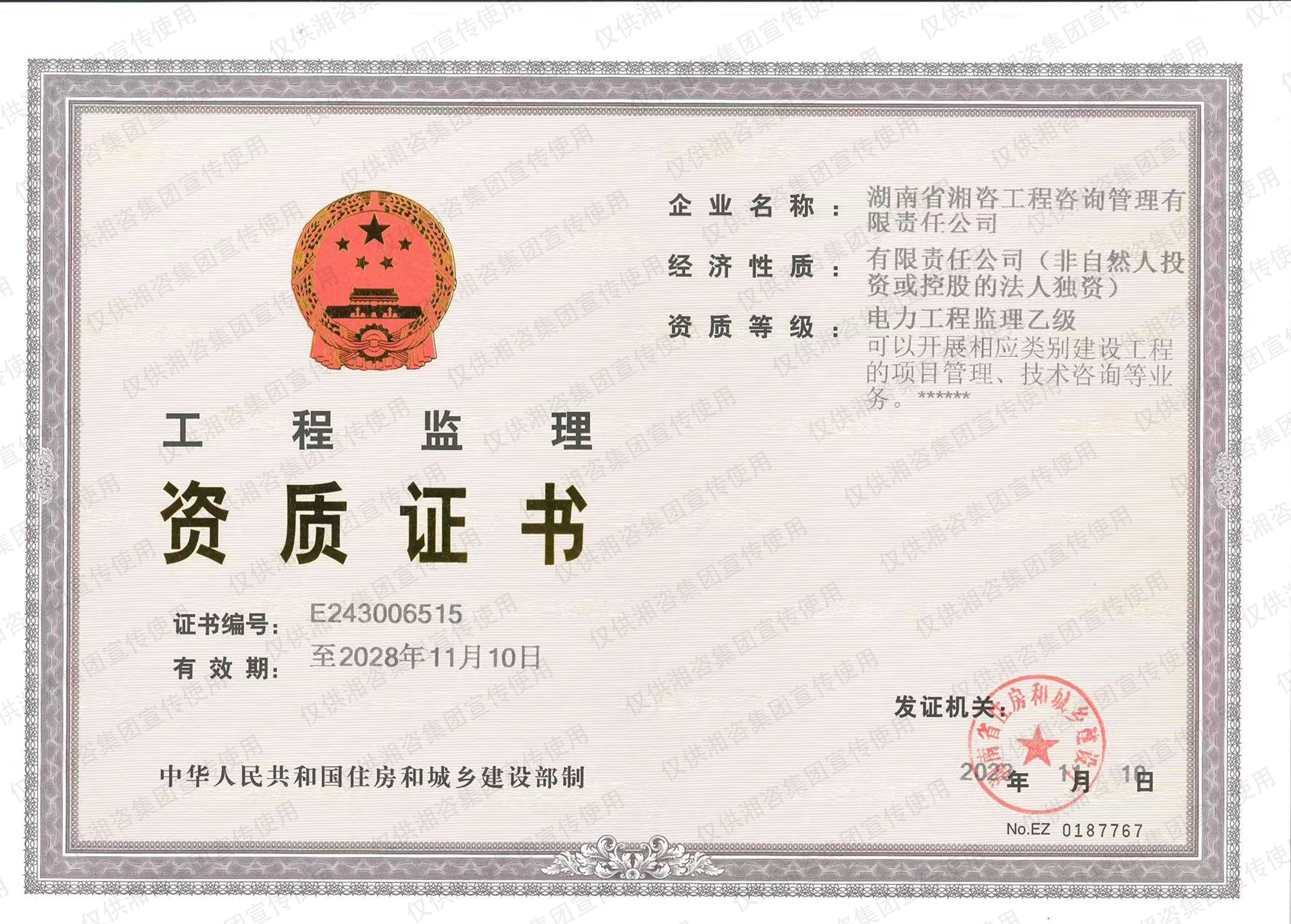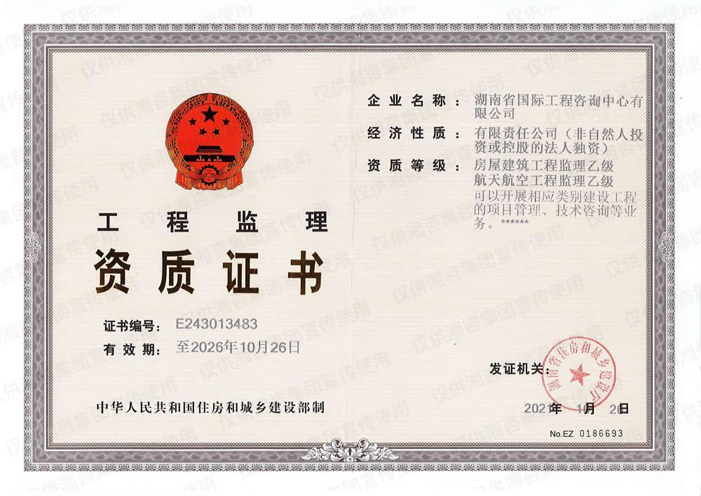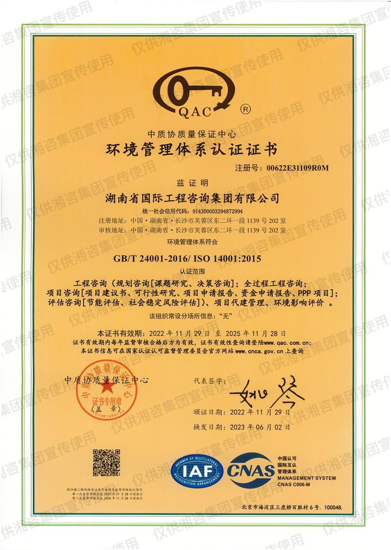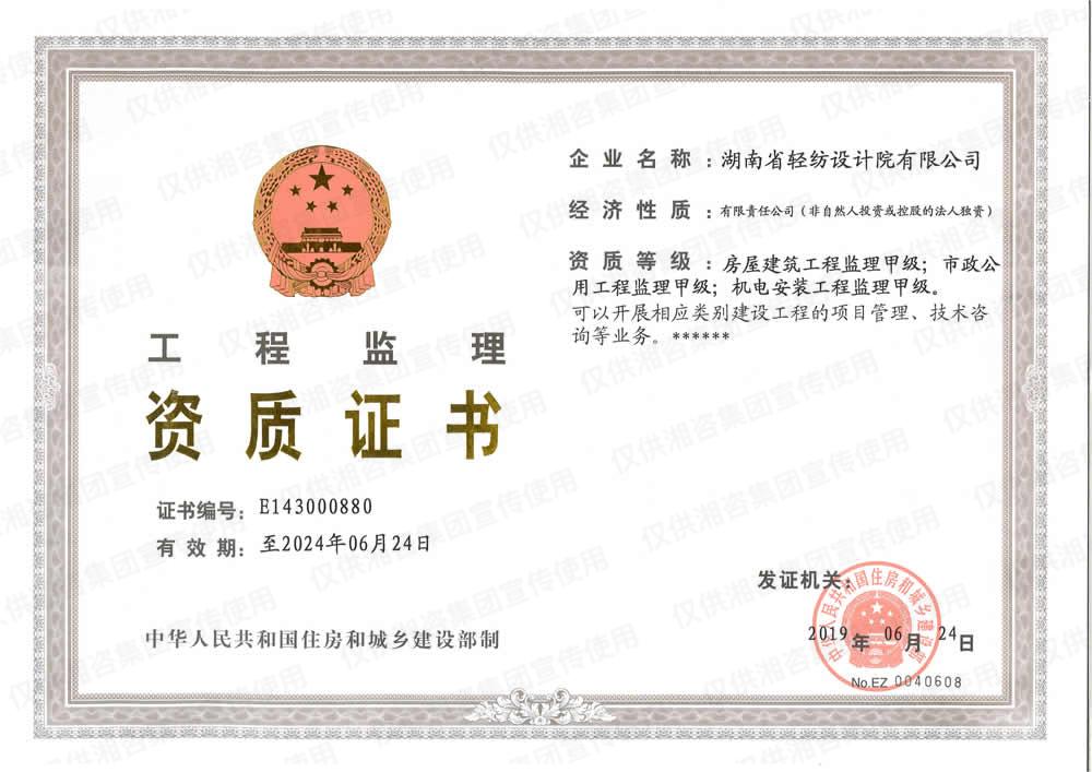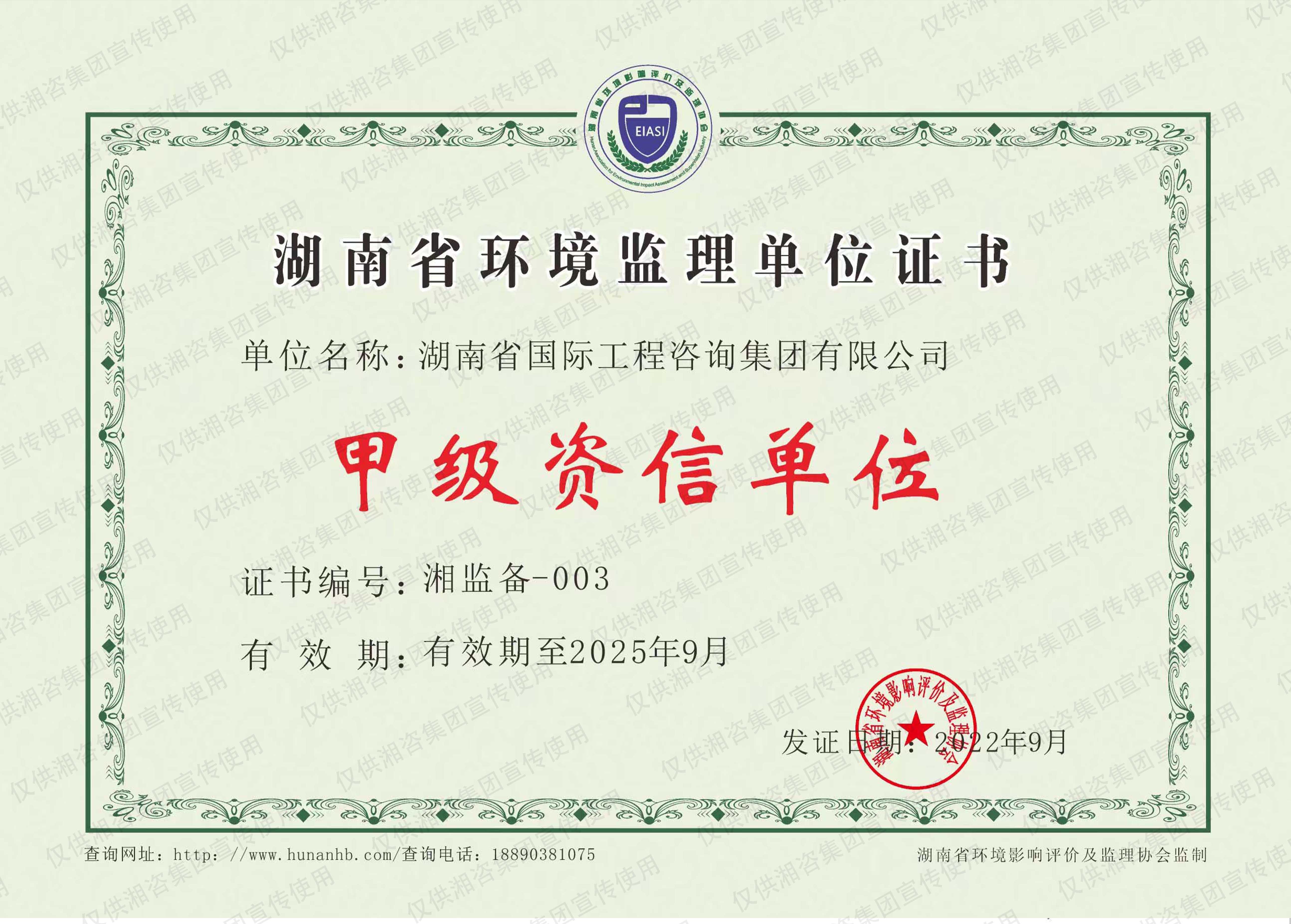 湖南省環(huán)境監(jiān)理證書(甲級(jí)資信單位)