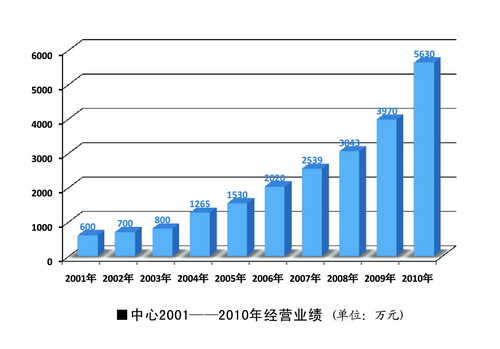 2010年,中心總收入達(dá)到5630萬(wàn)元,是2000年26萬(wàn)元的216倍。2004年,中心總收入過(guò)千萬(wàn),達(dá)到1265萬(wàn)元;2006年突破2000萬(wàn)元,達(dá)到2020萬(wàn)元;2008年突破3000萬(wàn)元,達(dá)到3043萬(wàn)元。中心總收入十年保持高速增長(zhǎng)。