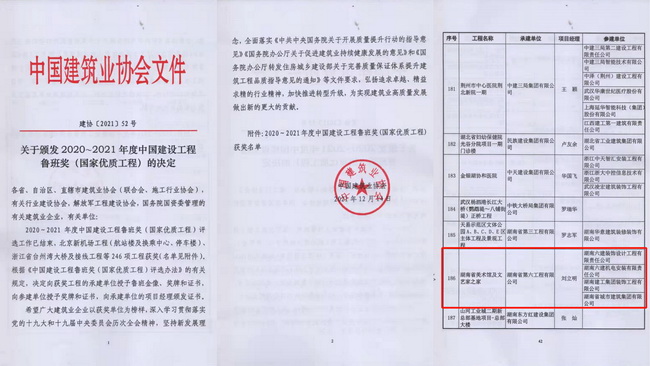 近日,中國建筑業(yè)協(xié)會公布“2020~2021年度中國建設(shè)工程魯班獎(國家優(yōu)質(zhì)工程)獲獎工程名單”,省咨詢公司代建的湖南省美術(shù)館項目、湖南文藝家之家項目、湖南美術(shù)館展陳裝修工程三個項目成功入選。據(jù)悉,這是公司代建項目首次榮膺此項殊榮,創(chuàng)造了公司代建工作新的歷史。