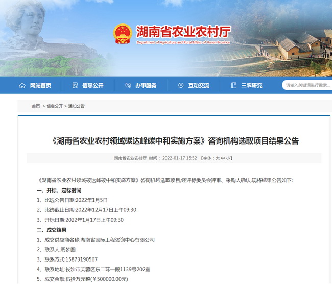 2022年1月17日,經(jīng)過(guò)與眾多投標(biāo)單位的激烈角逐,省咨詢公司憑借豐富的咨詢經(jīng)驗(yàn)、強(qiáng)大的技術(shù)團(tuán)隊(duì)、過(guò)硬的成果質(zhì)量和完善的服務(wù)標(biāo)準(zhǔn)順利中標(biāo)省農(nóng)業(yè)農(nóng)村廳《湖南省農(nóng)業(yè)農(nóng)村領(lǐng)域碳達(dá)峰碳中和實(shí)施方案》項(xiàng)目,項(xiàng)目中標(biāo)金額為50萬(wàn)元。