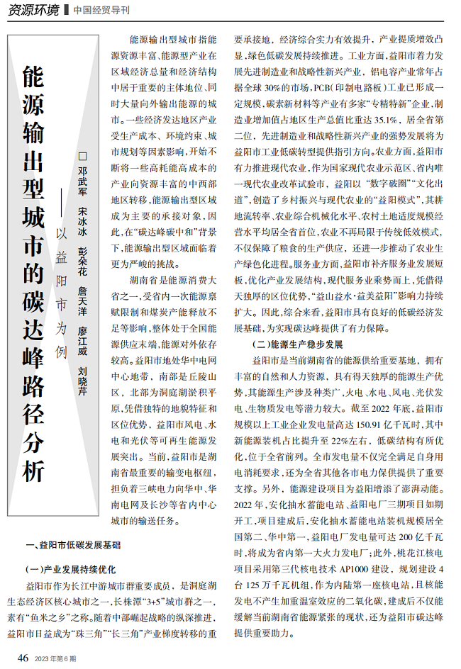 近日,由我司撰寫(xiě)的《能源輸出型城市的碳達(dá)峰路徑分析—以益陽(yáng)市為例》一文刊發(fā)于《中國(guó)經(jīng)貿(mào)導(dǎo)刊》2023年第6期,作者為我司生態(tài)規(guī)劃咨詢事業(yè)部鄧武軍、彭朵花、詹天洋、廖江威。