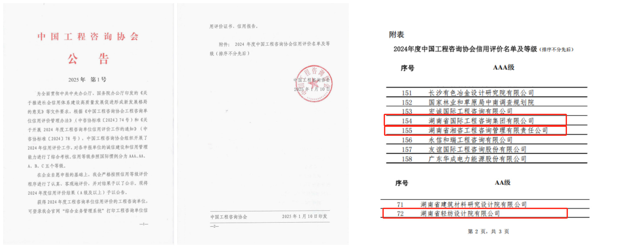 2025年1月10日,中國工程咨詢協(xié)會(huì)(下稱“中咨協(xié)”)發(fā)布2025年第1號公告,湘咨集團(tuán)成功獲評2024年工程咨詢單位信用評價(jià)等級AAA級。據(jù)省咨詢協(xié)會(huì)統(tǒng)計(jì),······